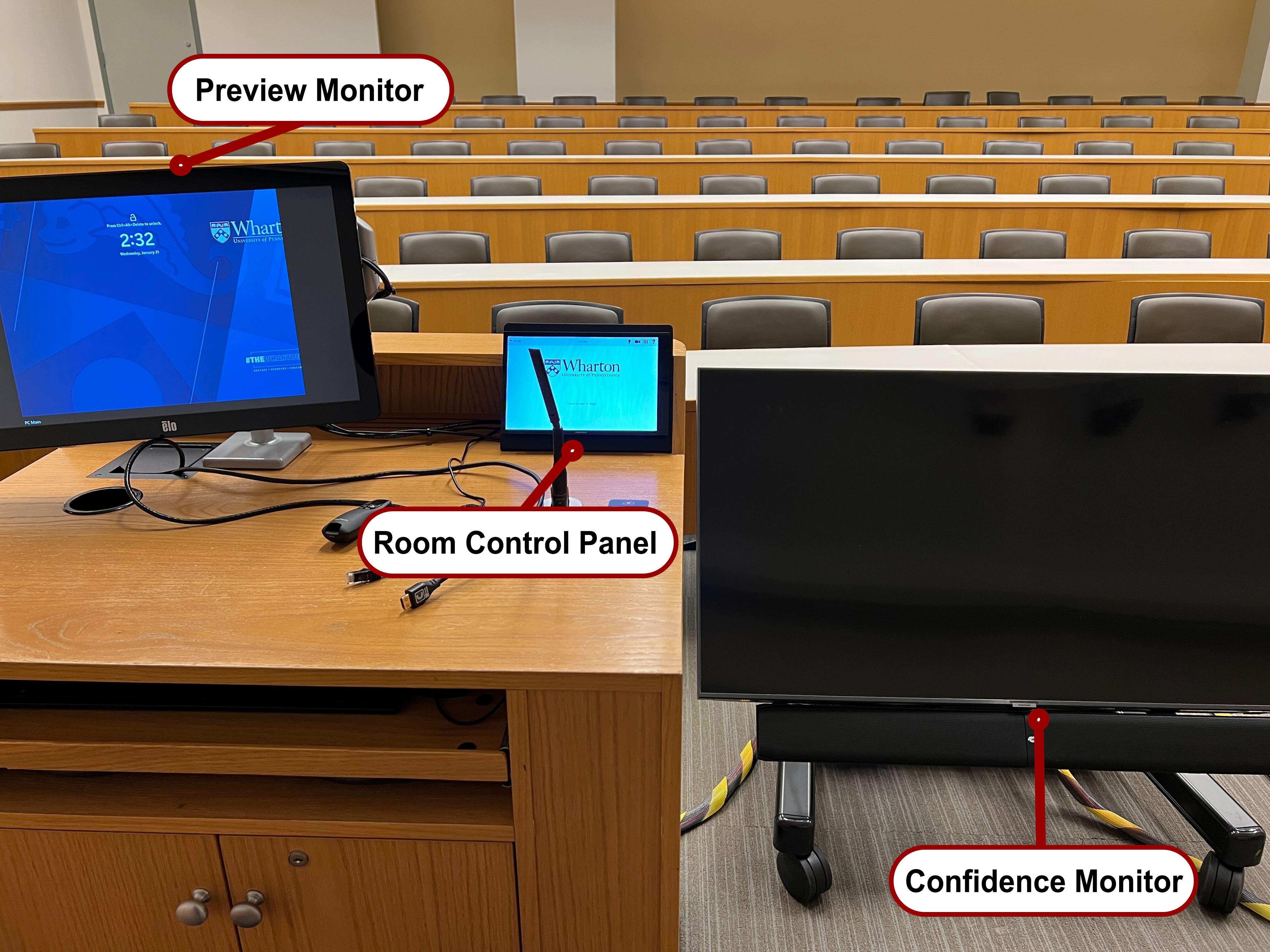 Walking into all classrooms you'll see two displays on top of the classroom lectern: the Preview Monitor and the Room Control Panel. In tiered classrooms you'll see the Confidence Monitor on the floor.