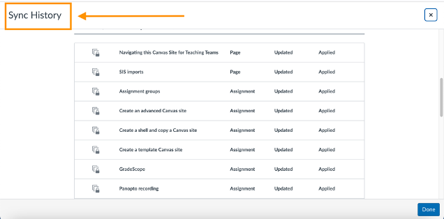 - You can review recent content syncs in the Sync History. This will show the time stamps of recent syncs along with a list of changes. The list will indicate whether a change was applied, and if not indicate what type of Sync Exception prevented the change.
