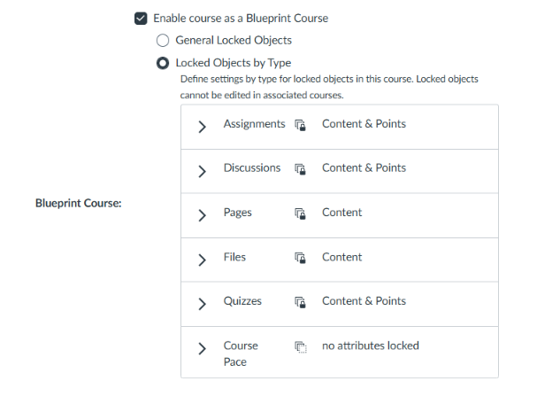 Course objects like assignments, files, and pages can be locked in the Blueprint parent site to prevent specific attributes from being changed in the associated sites.
