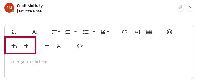 Canned text icons, the two plus signs highlighed below, are available on the Halo text editor when you're creating a private note or crafting an email reply.