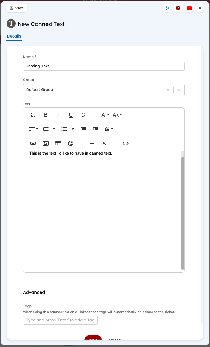 - Advanced: Add a tag under Advanced if you'd like to automatically tag any ticket that uses this particular canned text.