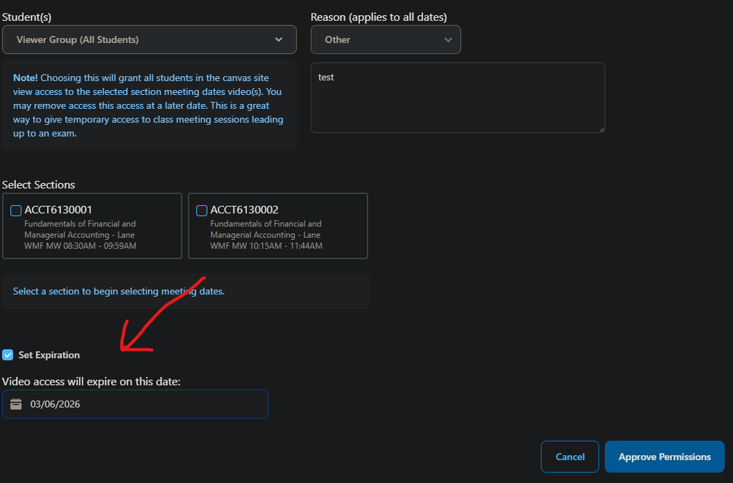 To set an Expiration Date, select the Expiration Date box below the “Select Sections” area. Then use the calendar picker to select the date you’d like access to expire. Click Approve Permissions buton.