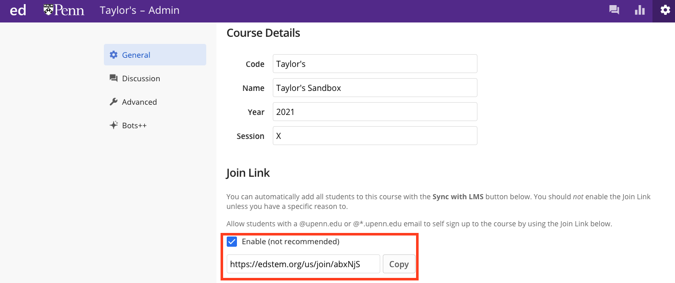 In the General section, it is not recommended to further edit your Course Details or send out a Join Link, as this syncing happens through Canvas. However, you will need to activate your course for each new semester once you are ready to make Ed Discussion available to students: