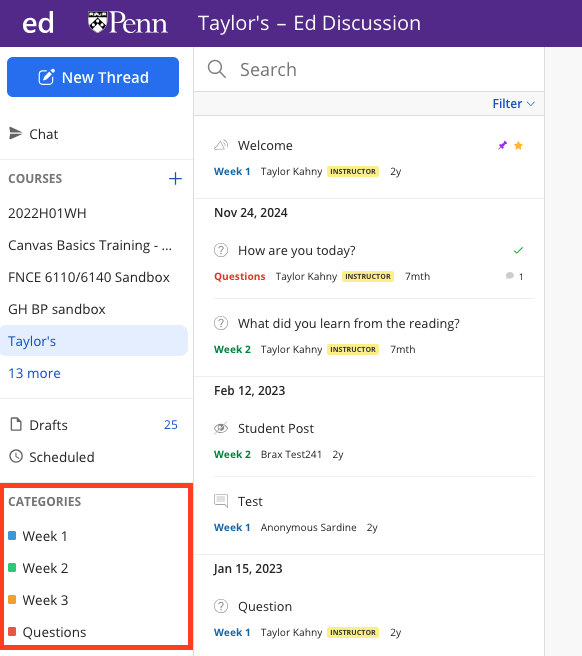 From the faculty perspective, Ed Discussion has a clear set of color-coded categories, a searchable discussion area, and a big blue button for posting new threads. It is recommended to include a pinned thread containing instructions for how the tool will be utilized in class, as students will likely have questions about discussion etiquette and overall setup. The categories you see on the lefthand side are customizable and will differ from course to course, so you can add, edit, and delete categories to best fit your teaching needs: