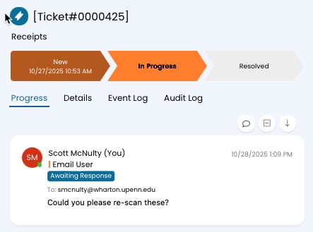 - An email editor will appear in the Progress section of the ticket. This allows you to compose an email to the requestor. Type an email, as you would normally, using the text controls in the editor to format the text.