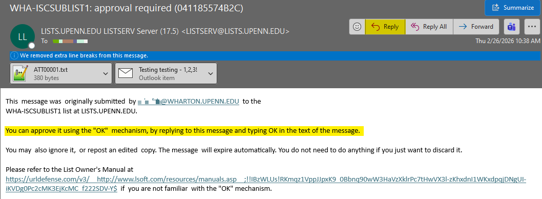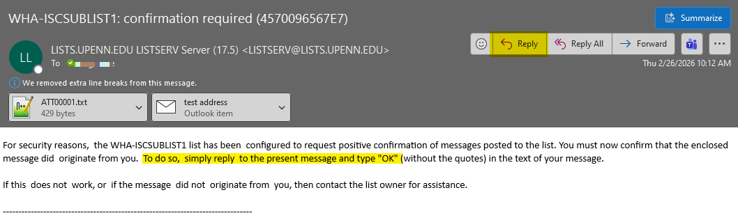 While you will continue to email your list as normal, ie. <listname>@wharton.upenn.edu , when self-confirming or moderating, you will no longer go through the Mailinglist application. Instead, you will receive an email prompt for a confirmation from ISC’s listserv. Reply to that prompt with OK in your message and your email will be released for distribution.