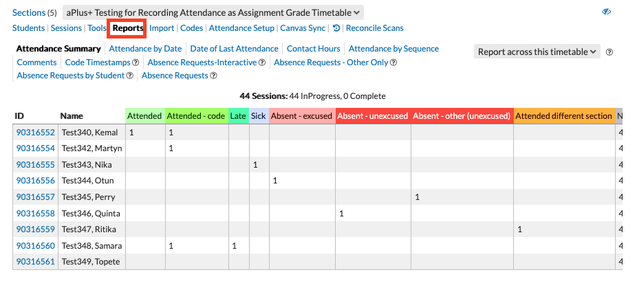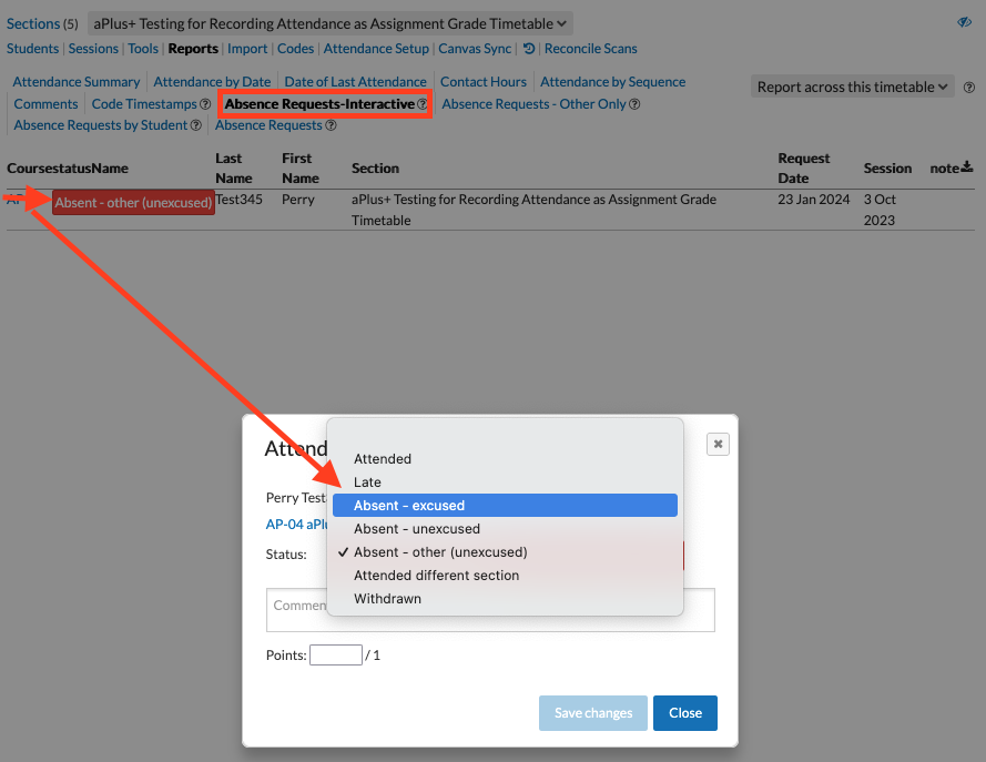 You can now access an interactive attendance report within the Reports tab in aPlus+. This will allow you to make changes to any student absence requests directly in the report. Follow the red arrows in this example: