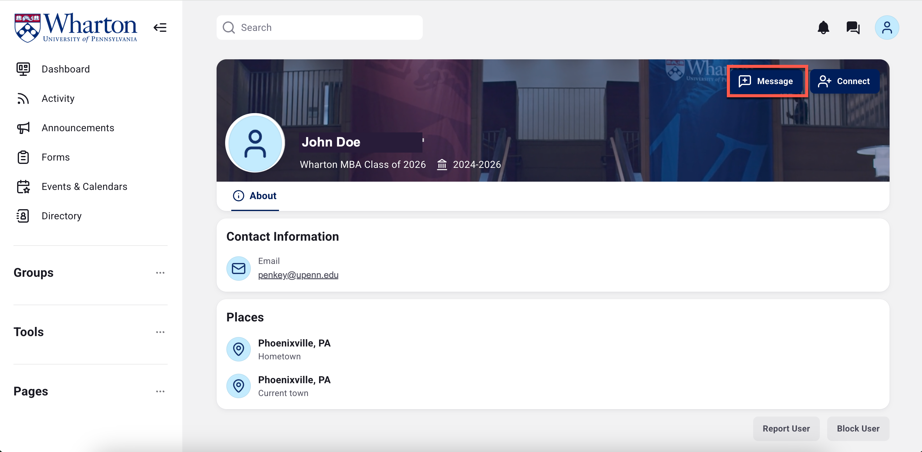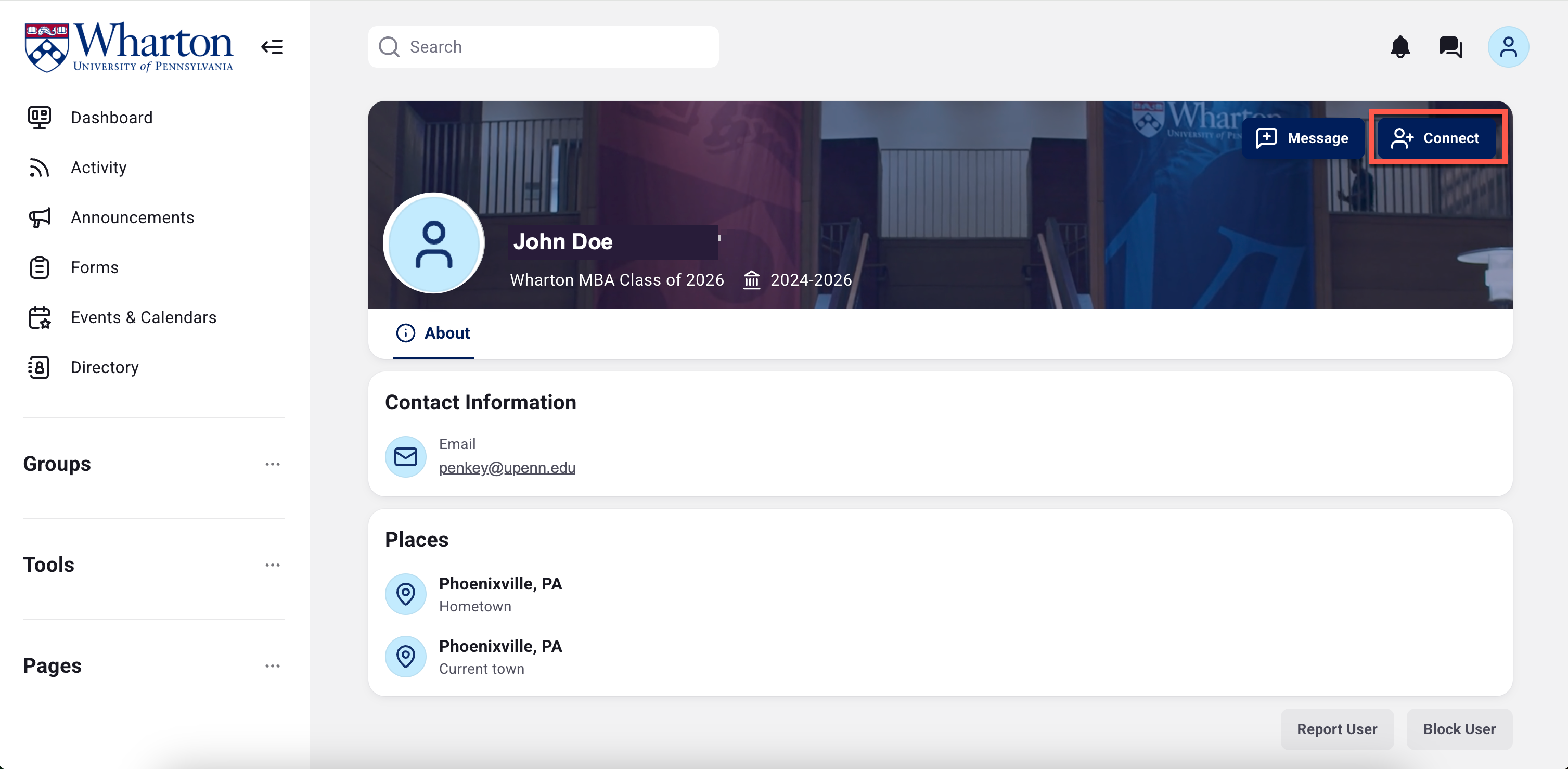 An individual's Profile will contain as much information as they upload. From a Directory page you can choose to Message or Connect with the individual. You can manage your own profile within MyWharton.