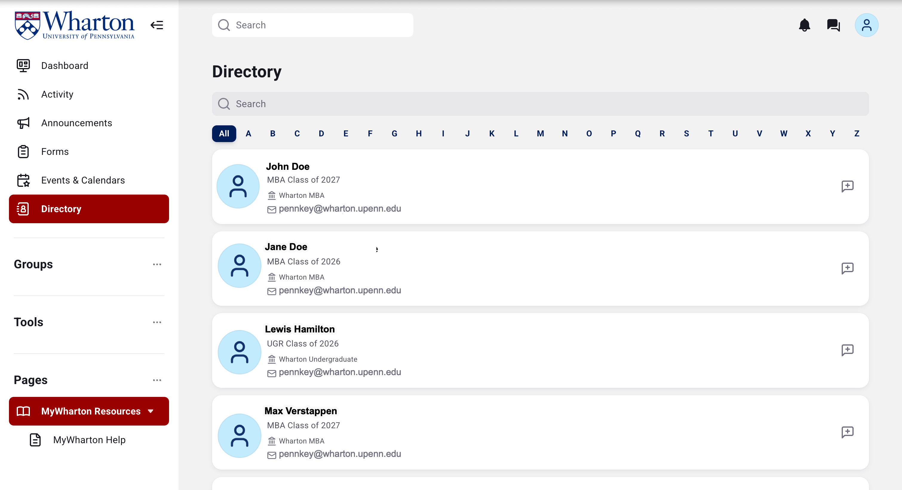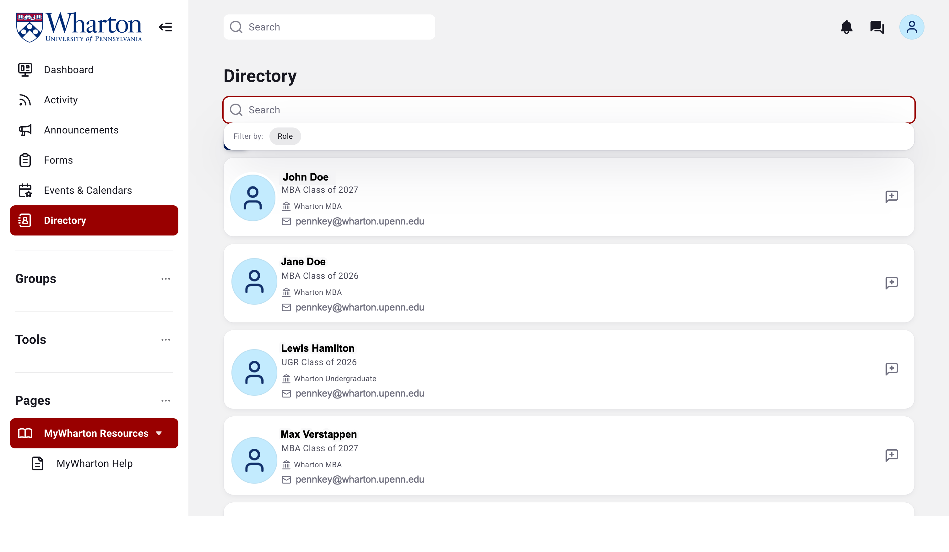 The Directory in MyWharton is a centralized tool that helps you find and connect with members of the Wharton student community. It is accessible through the main navigation menu on the left side navigation bar.
