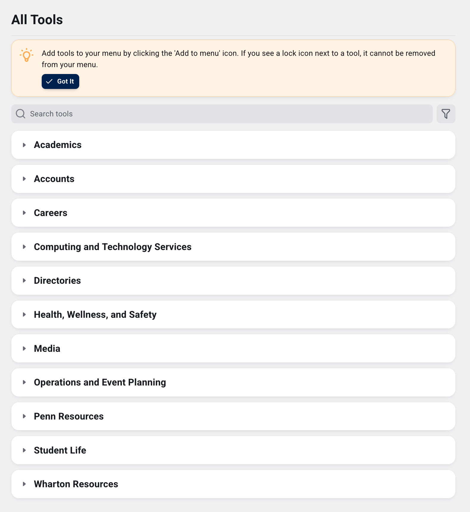 The MyWharton Tools section provides quick access to the systems and resources you use most often as a student. Whether it’s checking your email, accessing your learning management system, viewing your transcript, or logging into financial aid, Tools brings everything together in one convenient location. Many institutions customize this area based on your role or program, so the tools you see are tailored to your academic experience.