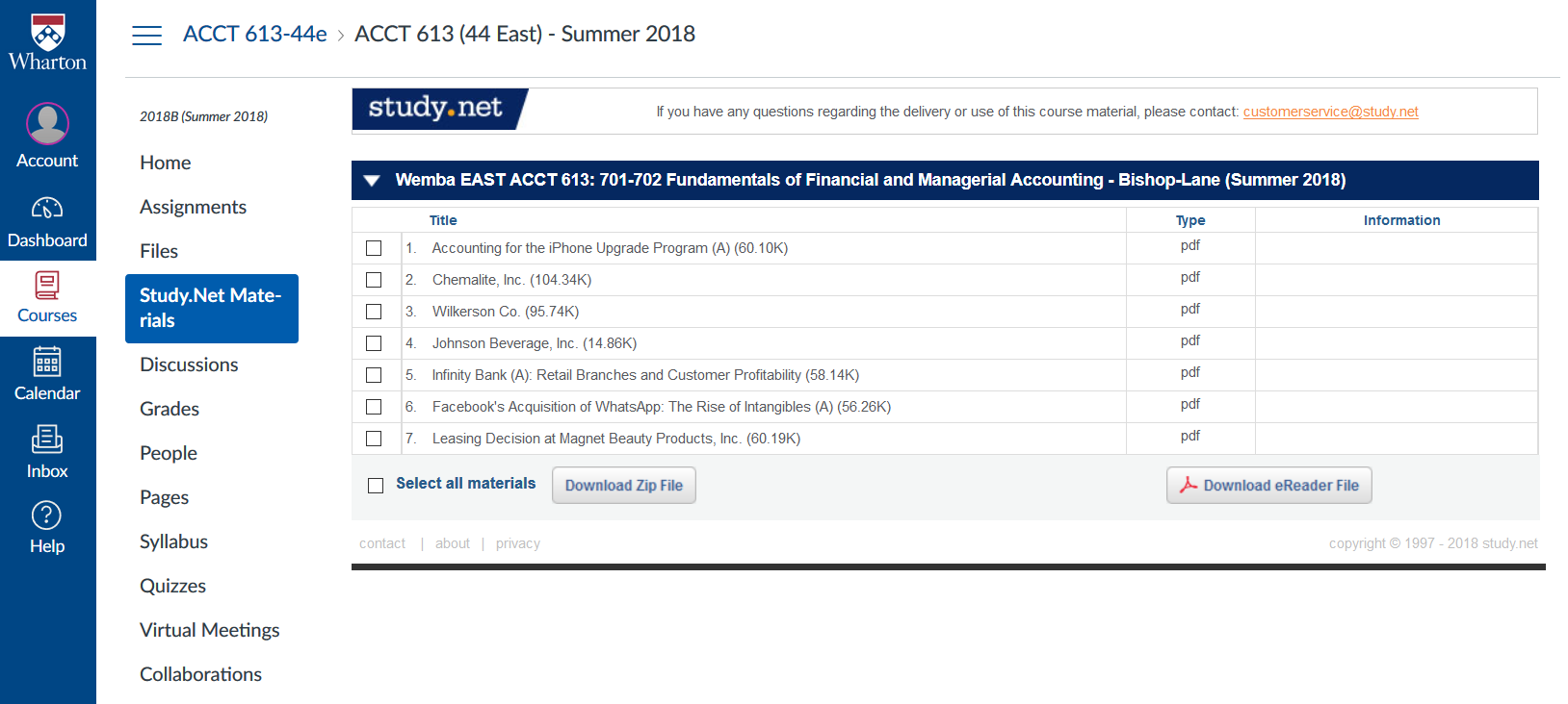 Study.Net Materials in Canvas is where we distribute “course packs” of externally-copyrighted licensed content from key suppliers, such as Harvard Business Publishing, requested by faculty. When specific readings are also available through Penn Libraries e-reserves, we can arrange for a related learning tool, Course Materials @ Penn Libraries, which is part of Lippincott Library's services for Wharton courses.
