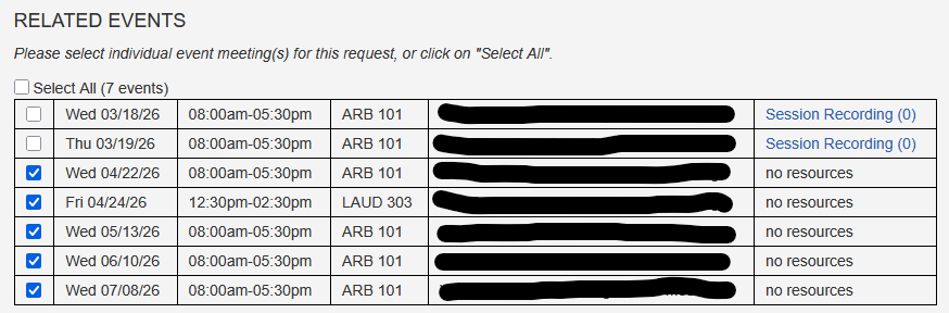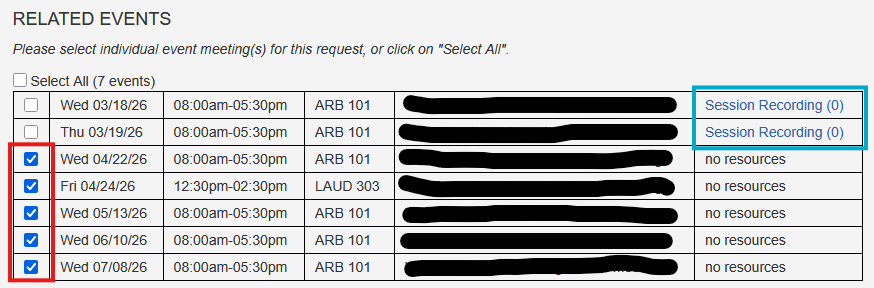 Select the checkbox for the session you want support for (red box). Current resources requested, if any, appear to the right (blue).