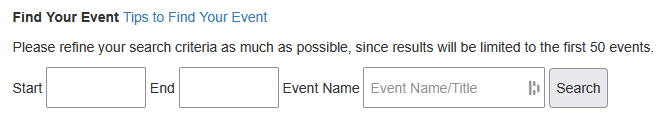 Only the main contact on the existing room reservation with Wharton Operations can locate an event. If you see the alert “Meetings for reservation not found, or meetings have already transpired,” reach out to Wharton Operations to confirm the main contact.