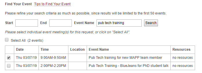Once you locate your event or provide reservation details, check the box(es) next to the events requiring technology.