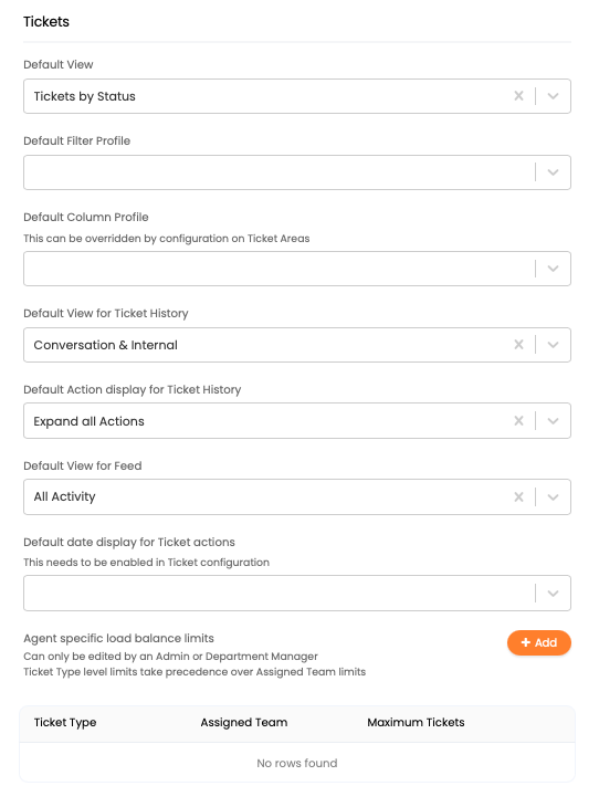 - Default View for Ticket History: By default the ticket history displays conversations (email) and Internal (notes). You can set this to "All Actions" or "Conversation."